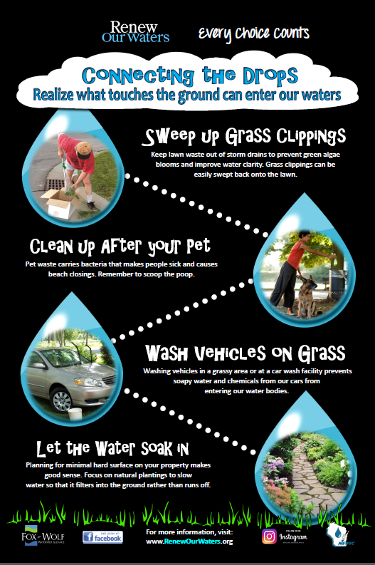 The Northeast Wisconsin Stormwater Consortium (NEWSC), is proud to unveil their new “Connect the Drops” posters and banners. These new designs are part of NEWSC’s “Renew Our Waters” Outreach and Education Campaign.