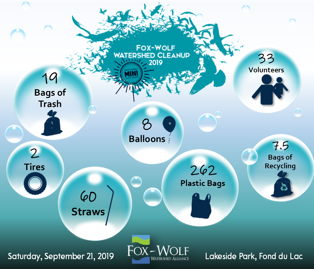 FWWA believes that the water resources of the Fox and Wolf River Basin are essential to the ecological and economic integrity of the region and the foundation of its quality of life. Participating in the Watershed Cleanup is one way that citizens can do their part for the water resources we all depend on. FWWA’s cleanup events help bring the community together to tackle litter in our watershed, and also offers the opportunity to highlight the issue further through the media and word of mouth.