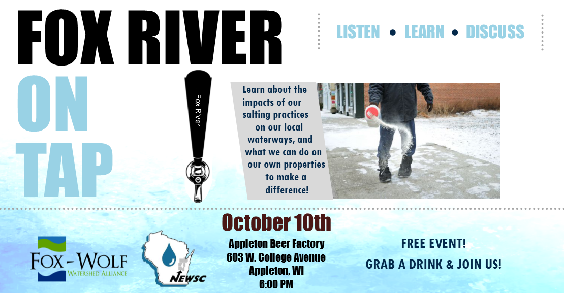 Our October 10th Fox River On Tap event invited local residents out for discussion on the impacts of over-salting on our waterways. Connie Fortin of Fortin Consulting provided an overview of varieties of de-icing salts and their impacts in our infrastructure and our environment. This event was coordinated in conjunction with two workshops held the same week, one in De Pere and one in Oshkosh. The workshops are coordinated by the Fox-Wolf Watershed Alliance, and utilize these experts to educate local snow plow contractors on the proper methods for winter parking lot maintenance. The On Tap event was geared toward local residents, and took place at the Appleton Beer Factory in downtown Appleton.