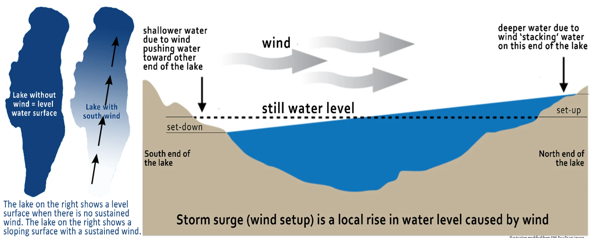 - Strong winds have pushed water toward one side of the lake.