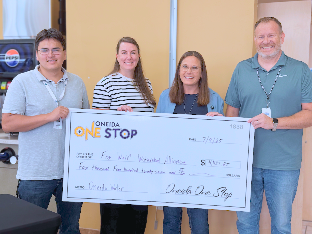 Through a partnership between Oneida Nation Retail and the Fox-Wolf Watershed Alliance, every purchase of Oneida-branded water helps fund water restoration in the region. The latest donation totaled $4,427.25, all from bottled water sales.