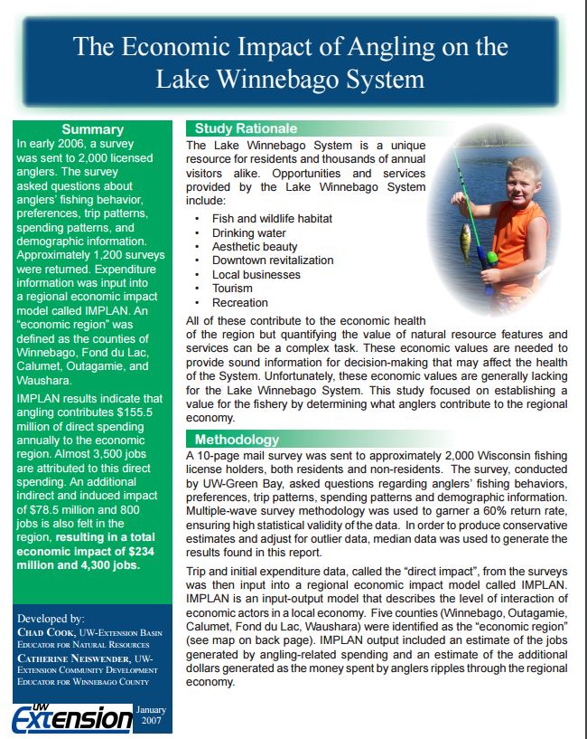 Report summary: “In early 2006, a survey was sent to 2,000 licensed anglers. The survey asked questions about anglers’ fishing behavior, preferences, trip patterns, spending patters, and demographic information. Approximately 1,200 surveys were returned. Expenditure information was input into a regional economic impact model called IMPLAN. An “economic region” was defined as the counties of Winnebago, Fond du Lac, Calumet, Outagamie, and Waushara.